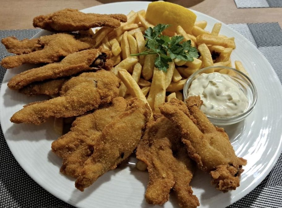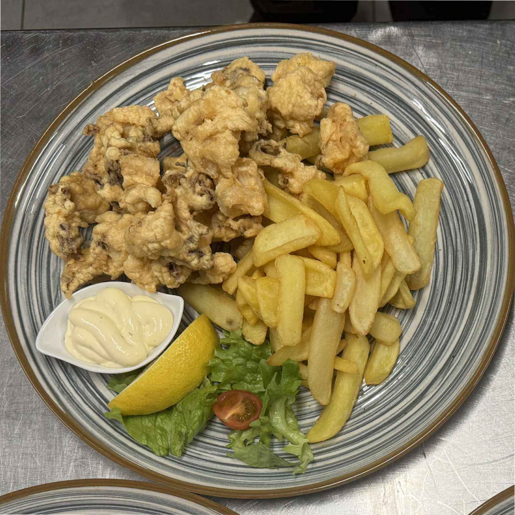 klasično pohane lignje s kriškom limuna i tartar umakom, idealne za lagani ručak ili večeru.